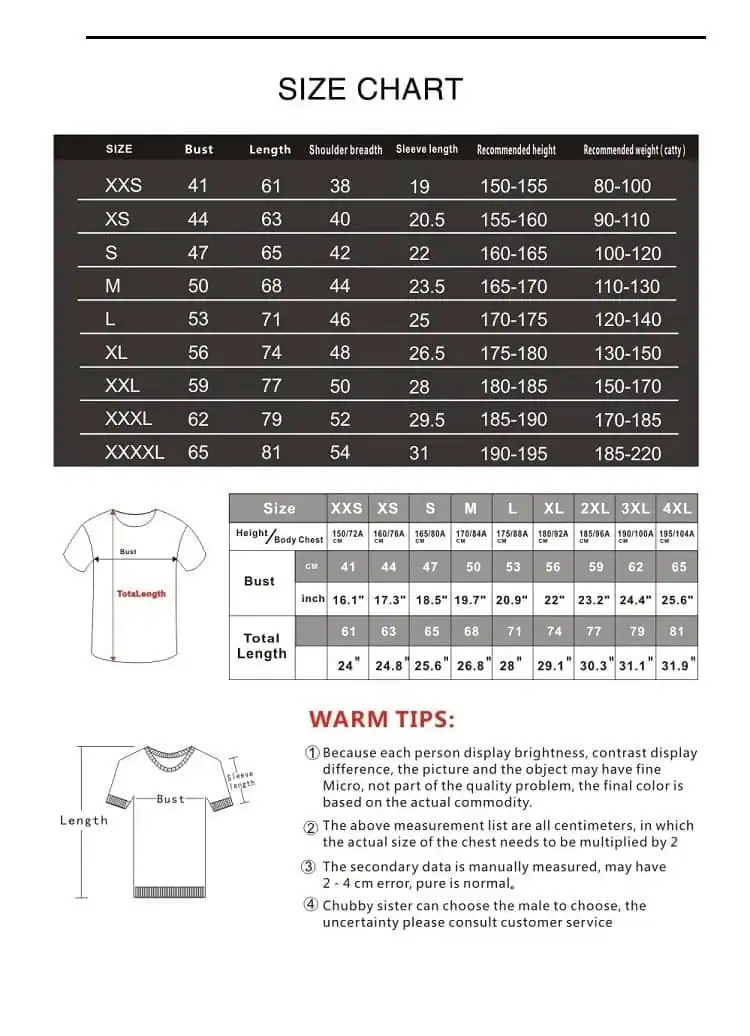 | T-Shirt Small Sizes | XS, S, M, L, XL, 2XL, 3XL, 4XL |